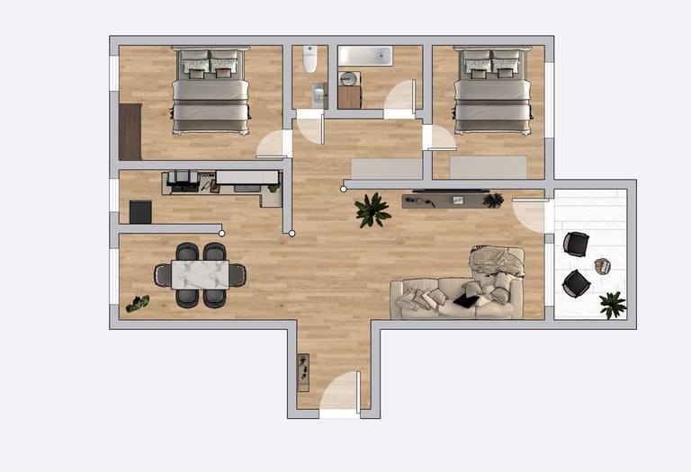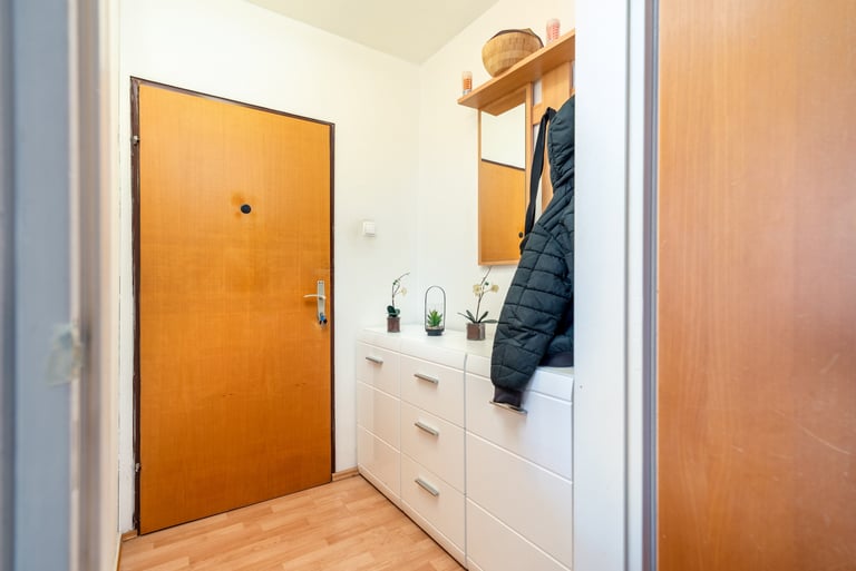 Stanovanje obsega 75,6 m² neto površine (od tega 67,5 m² uporabne), dodatno pa mu pripadata balkon (5 m²) in klet (3,1 m²). Razporeditev je zelo praktična in primerna tudi za družinsko bivanje. Ob vstopu vas pričaka hodnik, ki vodi v prostorno in svetlo dnevno sobo z jedilnico, ločeno kuhinjo ter dodatni hodnik z veliko vgradno omaro. Stanovanje obsega še dve spalnici, kopalnico s kadjo ter ločen WC. Iz dnevnega prostora je izhod na balkon, kjer lahko ob kavi ali druženju uživate v prijetnem pogledu na Pohorje.