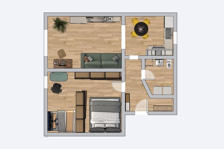 Stanovanje obsega prostoren hodnik, kopalnico z WC-jem in tuš kabino, kuhinjo z jedilnico, veliko dnevno sobo in spalnico iz katere se pride v otroško sobo. K temu še spada shramba, ki se nahaja pred samim vstopom v stanovanje in prostorno klet.